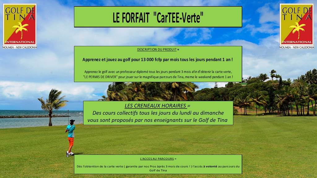 Situé dans un parc de 80 ha, à seulement 10 min du centre-ville, le Golf de Tina est un par 72 de 5 600 m avec une vue imprenable sur le lagon. Jouez au milieu de la forêt sèche pour un premier parcours de 9 trous vallonnés puis en bord de la mangrove et du lagon pour 9 autres trous. Le parcours de Tina vous offre une expérience de golf unique et est adapté à tous les joueurs, du débutant au plus confirmé.