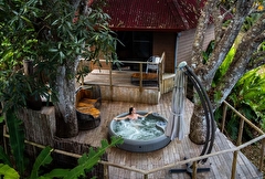 Zen bedroom bungalow – Capacity 2 people: This bungalow consists of a single bedroom on one level exclusively for 2 people. On its terrace, you can contemplate the forest and touch a few branches... And it is under the vault of the trees, in your spa, that you can dream and meditate on the world...