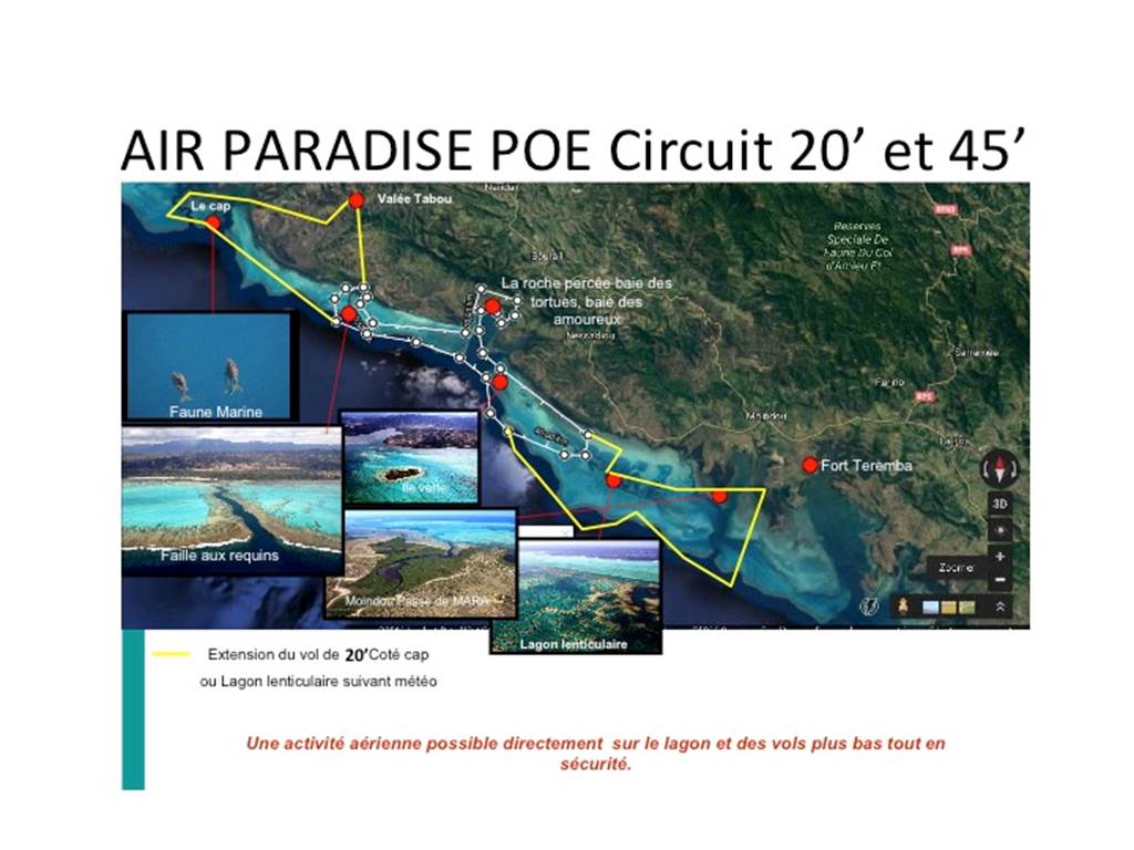 Air Paradise propose, depuis directement la plage ou l' aérodrome de POE en fonction des conditions météo, des parcours touristiques aériens pour découvrir l'incroyable beauté de La Nouvelle Calédonie, depuis une vue panoramique époustouflante.