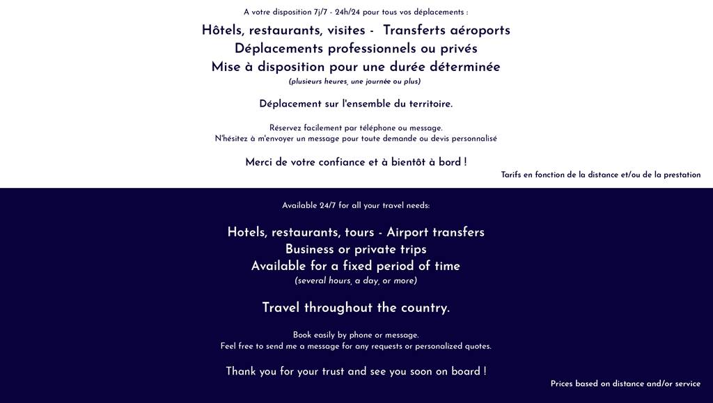 Oliver Boschet est un chauffeur privé disponible 24/h, 7j/7 sur tout le territoire . Fiable, discret, ponctuel, Oliver Boschet propose tous types de trajets professionnels ou privés : longue distance, vers ou depuis l'aéroport, courses, soirées, depuis ou vers votre hôtel ou résidence. A bord d'un Land Rover Discovery , vous serez confortablement installé dans un véhicule climatisé et désinfecté à chaque passage. À bord, sont à votre disposition masques, lingettes et bouteilles d'eau. Le tarif dépend du trajet et comprend jusqu'à 5 personnes.   Professionnel et à votre écoute, Oliver Boschet est disponible pour répondre à toutes vos demandes.  N'hésitez pas à réserver votre trajet privé.