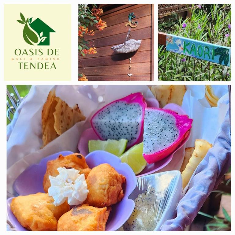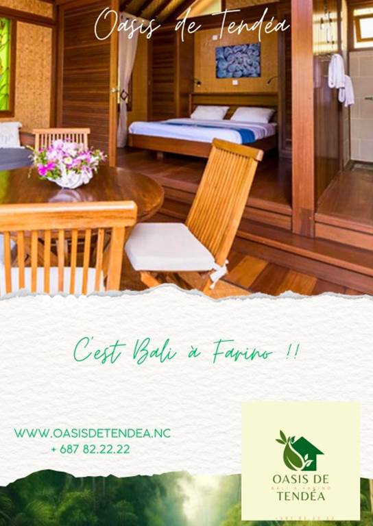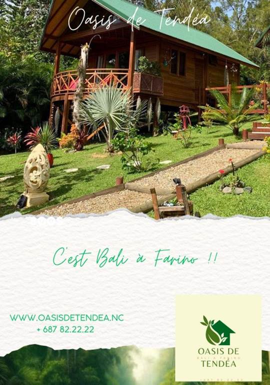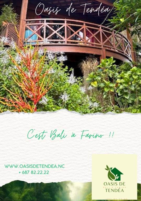 A 2 pas de la mairie de Farino, tout proche du parc de randonnée des Grandes Fougères, venez découvrir l'espace de l'Oasis de Tendéa sur un site d'exception. Ce lieu est un véritable havre de paix fait pour la détente et l'immersion en pleine nature. En remontant la rivière en contre bas, vous accèderez à une superbe cascade à 2 minutes à pied, où vous pourrez vous détendre et vous rafraichir ou bien nager en eau douce, dans un très grand trou d'eau. A VOTRE SERVICE SUR RESERVATION : - Réflexologie plantaire ou Belly révolution ou massage drainant des mains expertes de nos masseuses professionnelles au Faré Zen (sur réservation) - Coiffeuse au bungalow (coupe et/ou brushing 5.000 FCFP) - Panier petit-déjeuner local et copieux pour 2 - Dîner livré au bungalow (sauf le lundi) GRATUIT / OFFERT : - BD locales / romans - Jeux de société Pour tout renseignement, Vanessa 747 000 ou Philippe 78 04 70. Commander un menu dîner (hors lundi, avant 18h au plus tard) Tartare de thon ou Burger (boeuf) ou crevettes panées + salade + frites (3.000 FCFP/plat au choix) A la réservation ou par sms +687 747 000 Réserver vos viennoiseries ou panier Gaby de Focola 2.000 FCFP le panier pour 2 A la réservation ou par sms +687 747 000 Résumé des meilleurs avis sur l'Oasis de Tendéa "Une expérience inoubliable ! L'Oasis de Tendéa offre un cadre magnifique et paisible au cœur de la nature. Les bungalows sont confortables et bien équipés, offrant une vue imprenable sur la végétation luxuriante. Le personnel est chaleureux et accueillant, prêt à répondre à tous les besoins des clients. Un endroit parfait pour se détendre et se ressourcer." "Un véritable paradis caché ! L'Oasis de Tendéa est un joyau de tranquillité niché dans les collines verdoyantes de Farino. Les jardins sont magnifiquement entretenus, et la piscine naturelle est rafraîchissante. Les repas servis sont délicieux, mettant en valeur les saveurs locales. Une escapade parfaite pour ceux qui recherchent la sérénité et l'authenticité." "Un séjour inoubliable ! L'accueil chaleureux et la convivialité du personnel de l'Oasis de Tendéa sont exceptionnels. Les activités proposées, telles que la randonnée dans la forêt tropicale environnante et la visite des cascades, permettent aux clients de découvrir la beauté naturelle de la région. Les chambres sont confortables et offrent une vue imprenable. Un lieu à ne pas manquer lors d'un voyage en Nouvelle-Calédonie." "Un vrai paradis terrestre ! L'Oasis de Tendéa est l'endroit idéal pour se déconnecter du monde extérieur et se reconnecter à la nature. Les bungalows sont spacieux et bien aménagés, et la vue depuis la terrasse est à couper le souffle. Les propriétaires sont attentionnés et passionnés, ce qui se reflète dans chaque aspect de l'établissement. Une expérience à vivre absolument !" Ces avis illustrent la beauté naturelle, l'hospitalité exceptionnelle des nouveaux hôtes depuis fin décembre 2023, Philippe et Vanessa, et l'atmosphère paisible de l'Oasis de Tendéa, en faisant une destination de choix pour les voyageurs en quête de détente et d'authenticité. *Veuillez noter que nous ne prenons pas l'American Express. Veuillez enregistrer votre réservation avec une carte de crédit VISA ou MASTERCARD. Annulation ou modification du fait du client Il est rappelé au client qu'il ne dispose pas de droit de rétractation ou d'annulation à moins de 07 jours de la réservation. Les réservations avec prépaiement ne pourront faire l'objet d'aucune modification et/ ou annulation. Les sommes versées d'avance que sont les arrhes ne feront l'objet d'aucun remboursement. L'annulation à la demande du client de la réservation peut s'effectuer directement auprès du prestataire dont les coordonnées téléphoniques sont précisées sur la confirmation de la réservation envoyée par courrier électronique. Sauf mention contraire, toute réservation est nominative et ne peut en aucun cas être cédée à un tiers, que ce soit à titre gratuit ou onéreux.