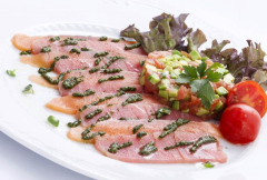 - Carpaccio de cerf ou boeuf selon arrivage à l'huile parfumée au basilic, pétales de parmesan et sa petite salade verte - MOYEN : 2 000 CFP / GRAND : 2 300 CFP